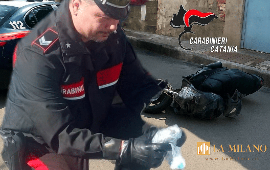 Il minorenne, catanese, è stato bloccato e identificato. Nello scooter, i Carabinieri hanno trovato un bastone telescopico sfollagente, 180 euro in contanti e altri 600 euro nel vano portaoggetti, ritenuti provento dell’attività di spaccio.